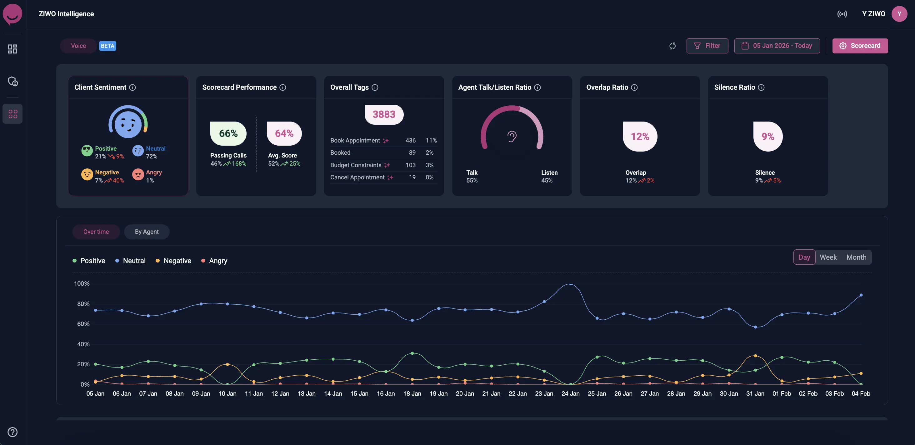 تتبع تحليل المشاعر، ونسب التحدث والاستماع، وفترات الصمت، والتداخل، والتوجهات حسب الموظف أو عبر الزمن.
